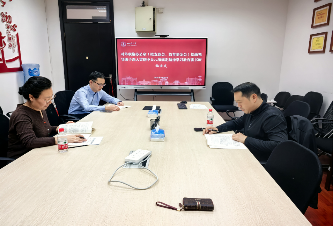 为持续深化作风建设,切实增强党员干部的政治自觉和纪律意识,根据《中共中央办公厅关于在全党开展深入贯彻中央八项规定精神学习教育的通知》精神和《中共四川大学委员会关于开展深入贯彻中央八项规定精神学习教育的实施方案》要求,对外联络办公室(校友总会、教育基金会)班子成员于4月8日-4月10日在望江校区行政楼601组织开展了“深入贯彻中央八项规定精神”专题读书班,通过集中学习、研讨交流、案例剖析等形式,推动中央八项规定精神入脑入心、见行见效。支部书记杨光,副书记白鹏,纪检委员贾秀娥参加了本次学习。